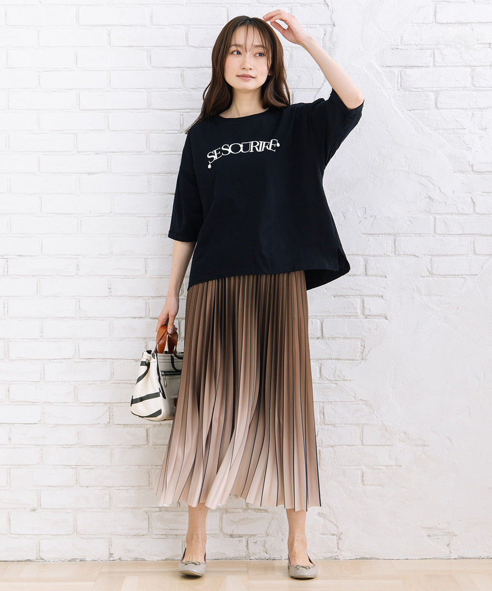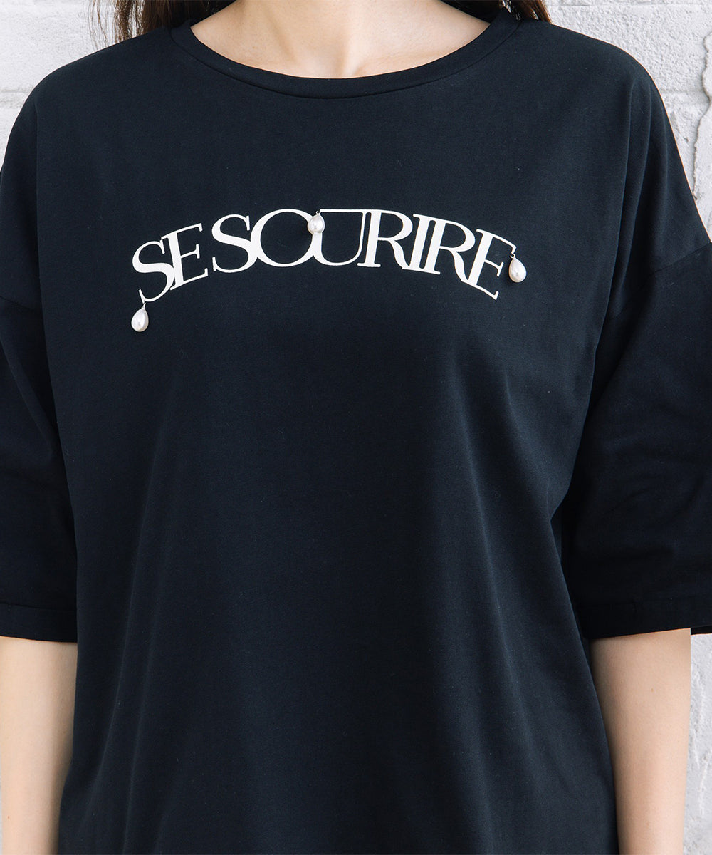 ロゴ部分にあしらったパールデコレーションが、カジュアルなTシャツに上品さをプラス。