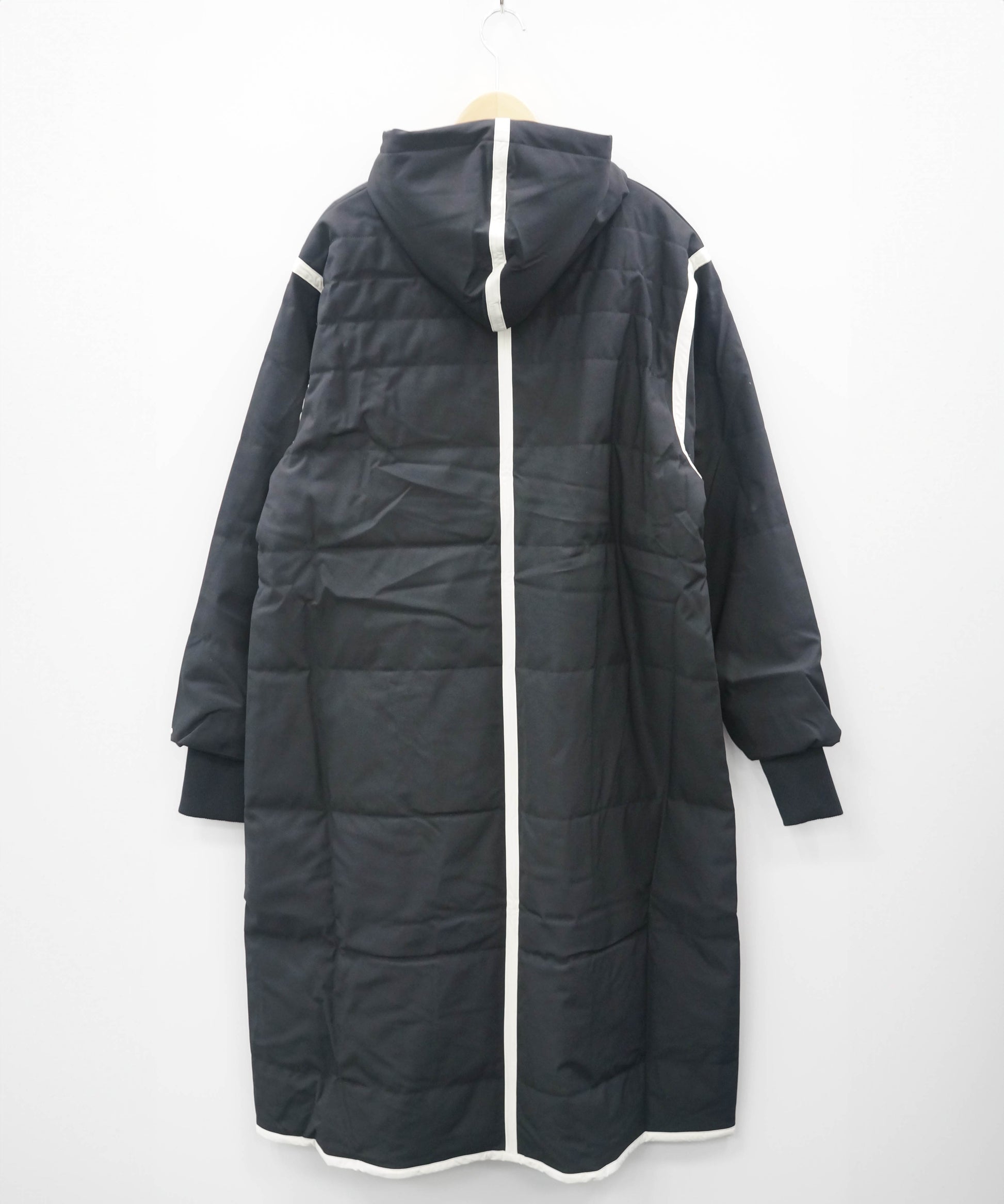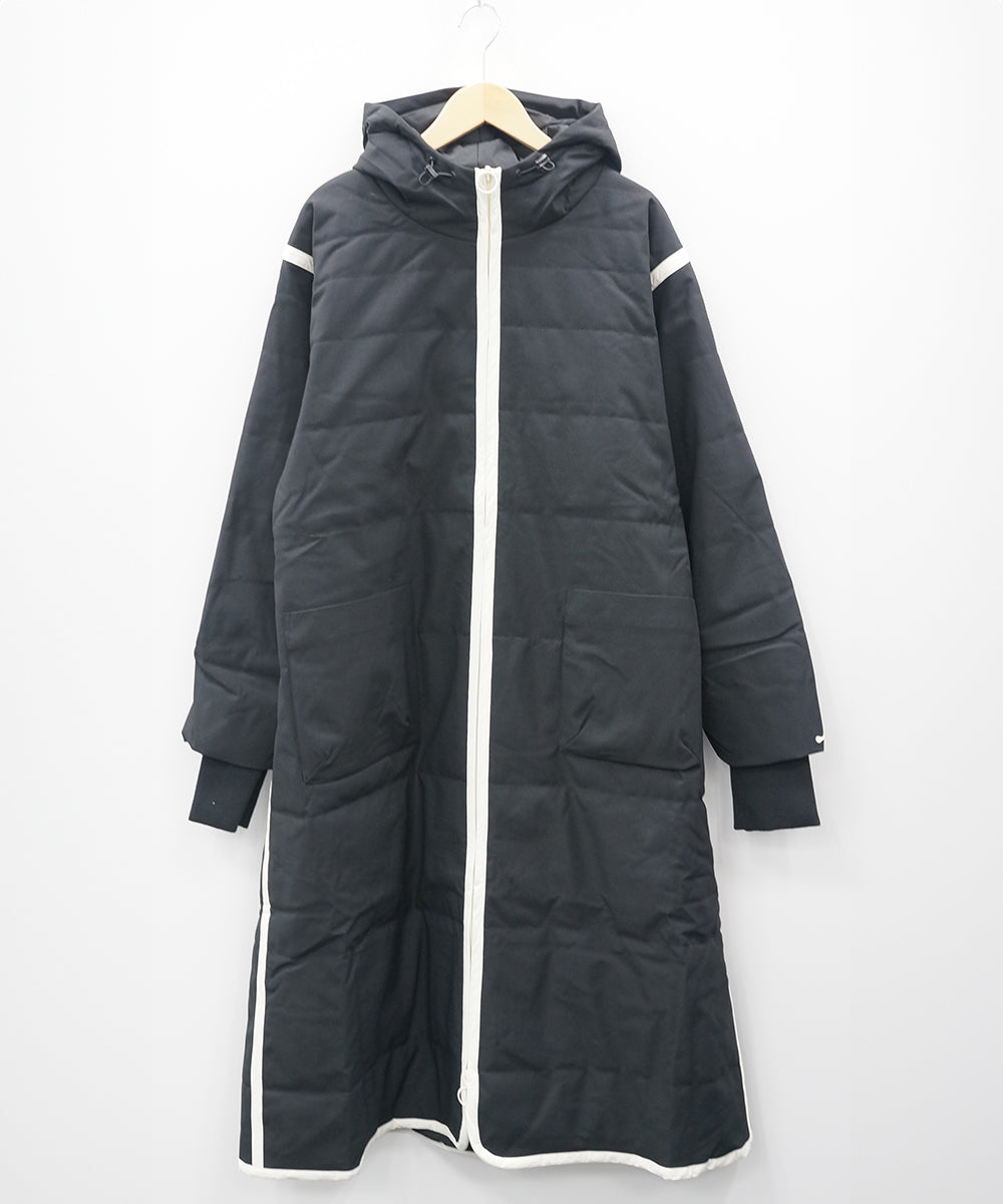 ブラックベースにホワイトのパイピングを効かせたロングコート。