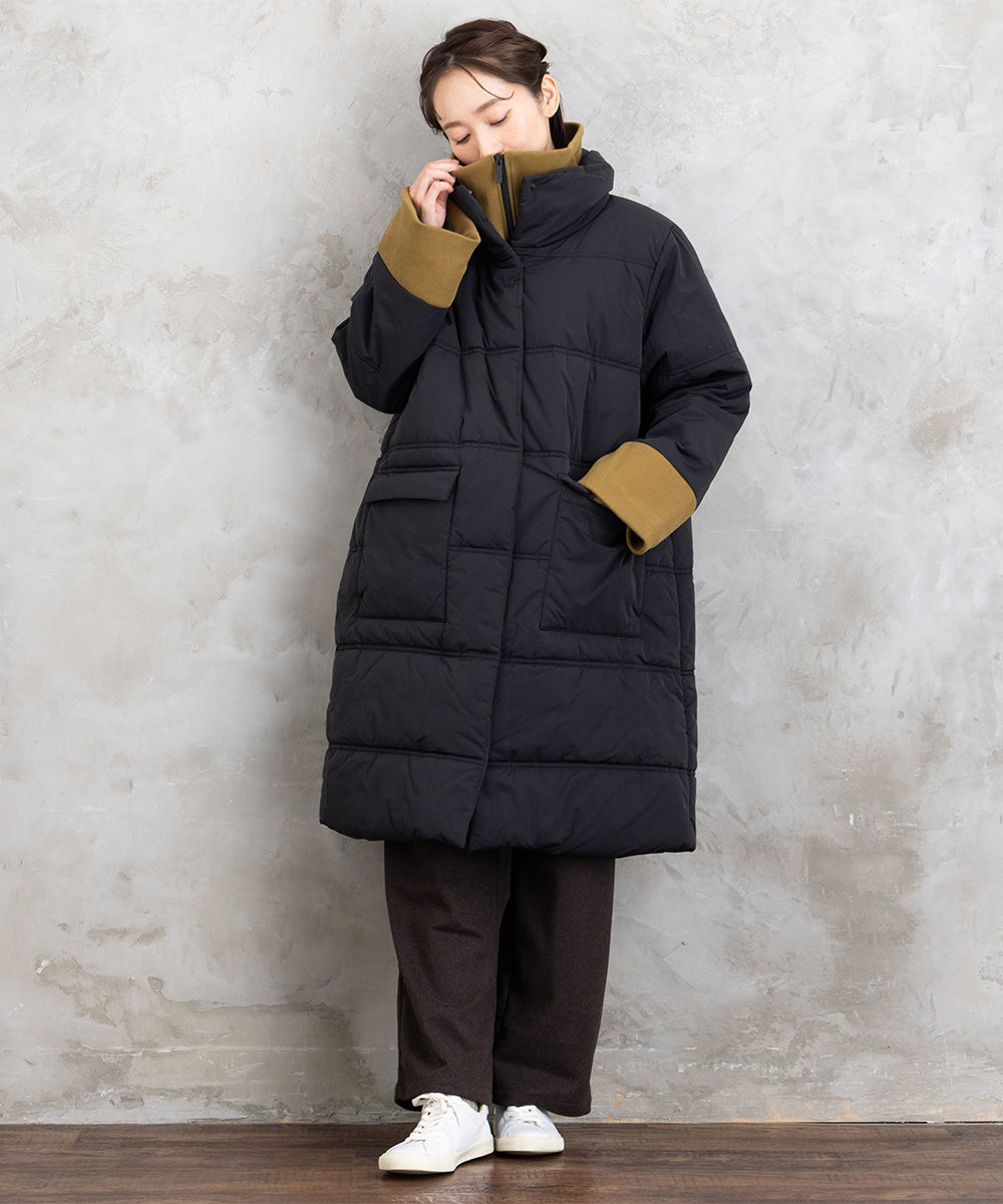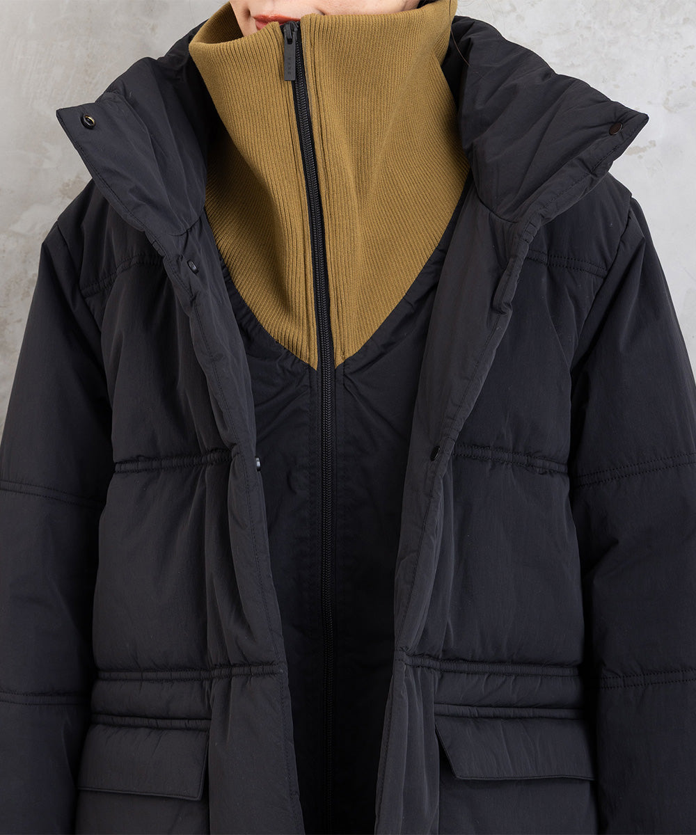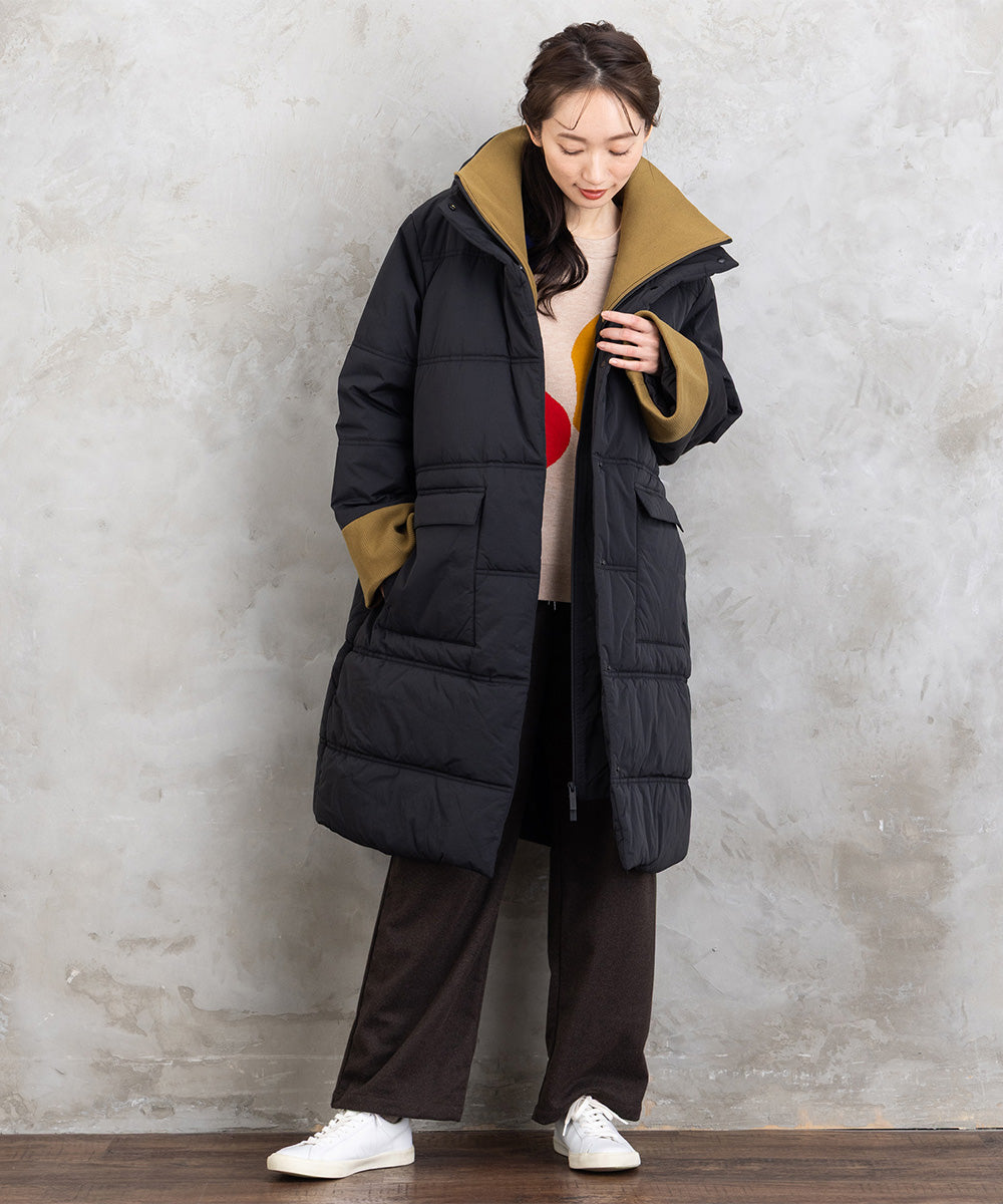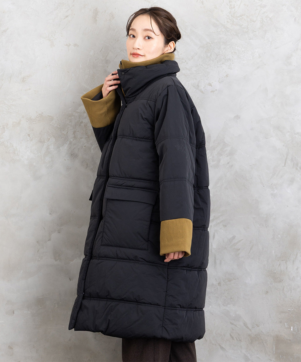 異素材を重ね着したようなデザインが目を惹くロングコート。