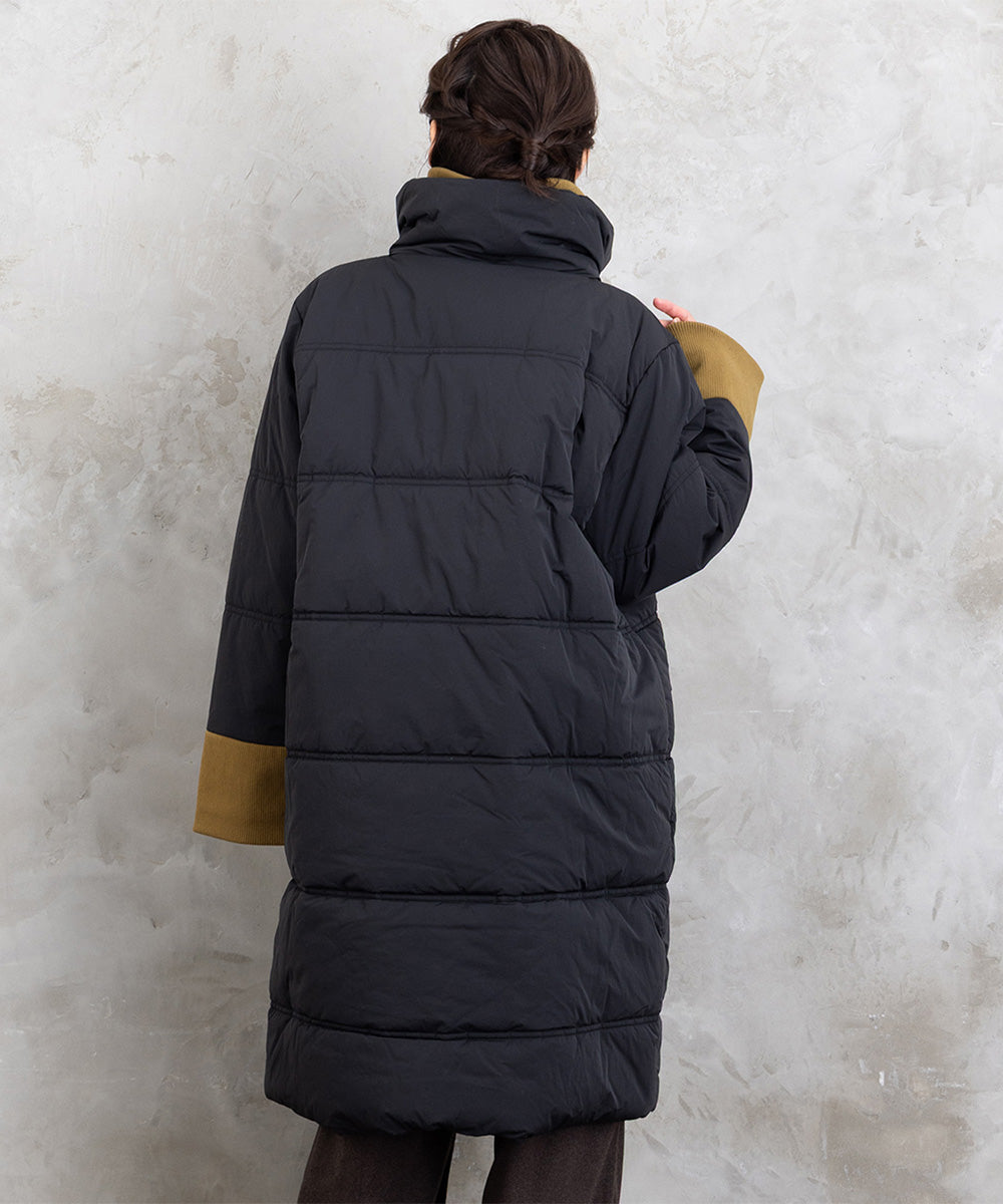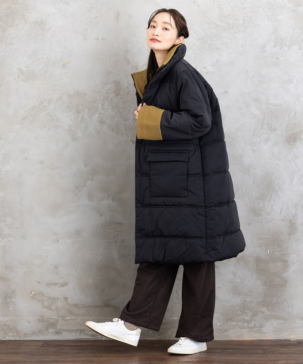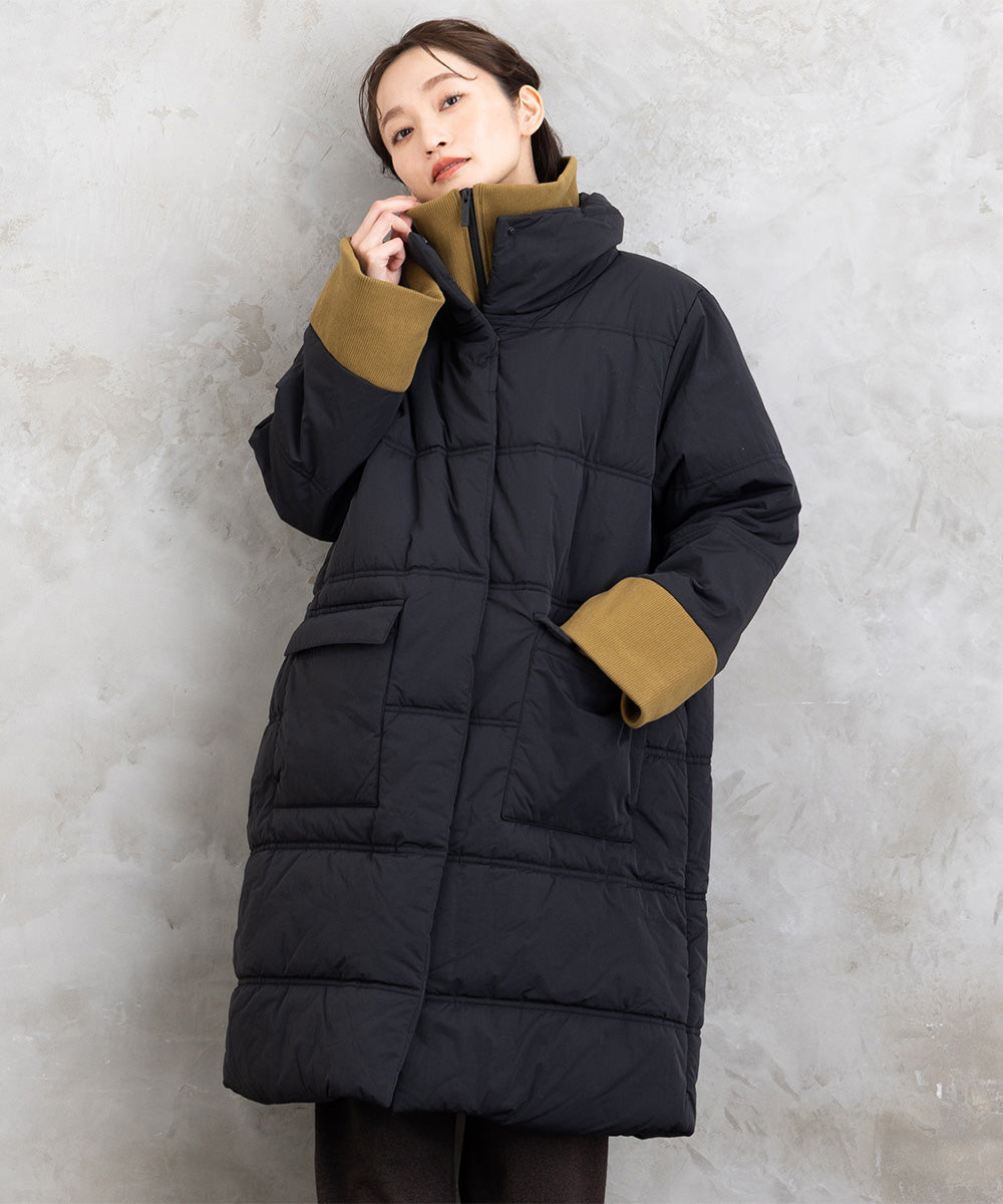 異素材を重ね着したようなデザインが目を惹くロングコート。