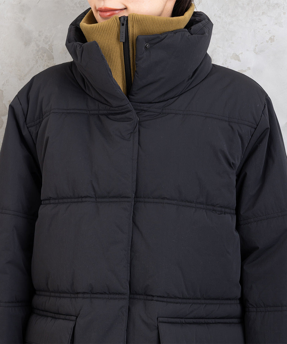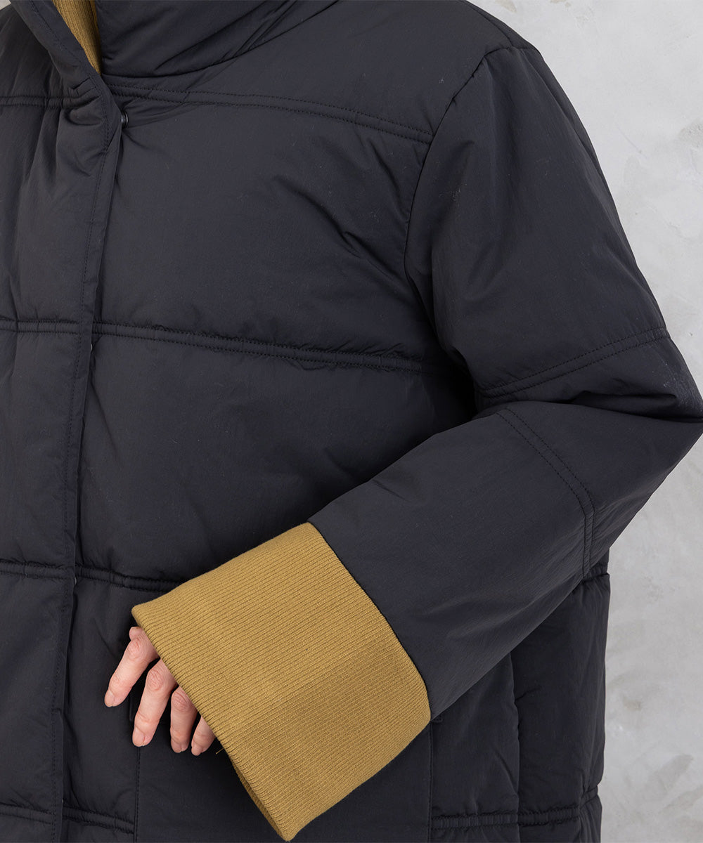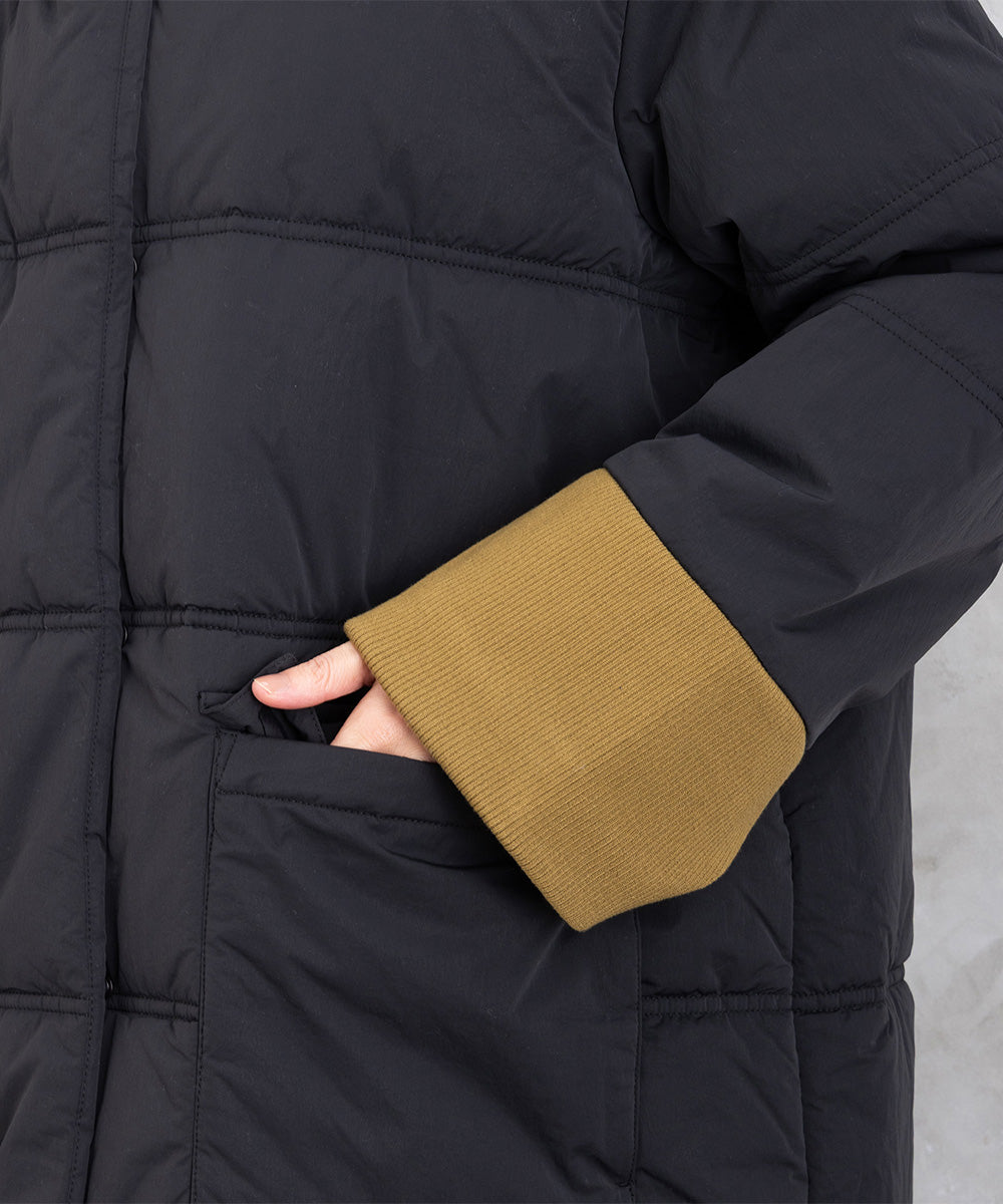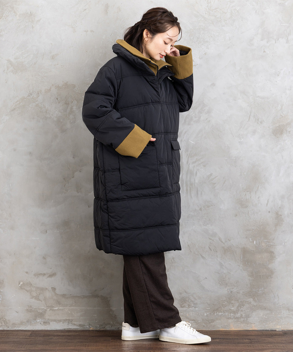 異素材を重ね着したようなデザインが目を惹くロングコート。