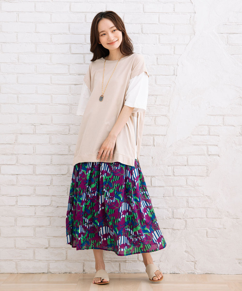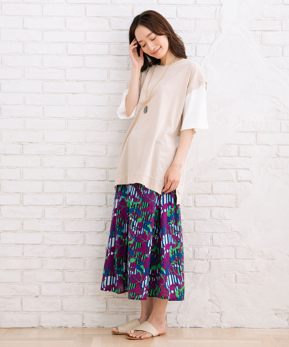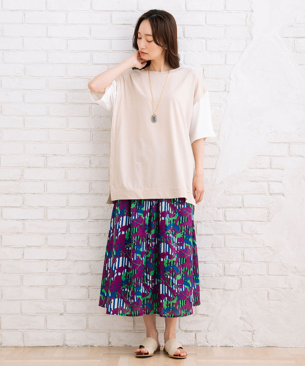 シンプルなTシャツやブラウスに合わせるだけで、上品かつ旬なスタイルが完成。