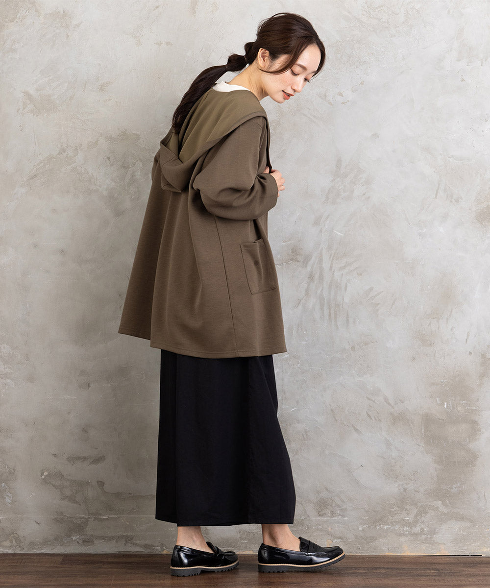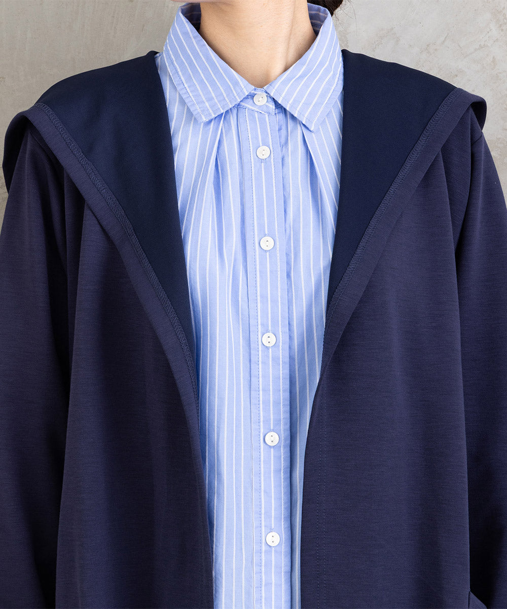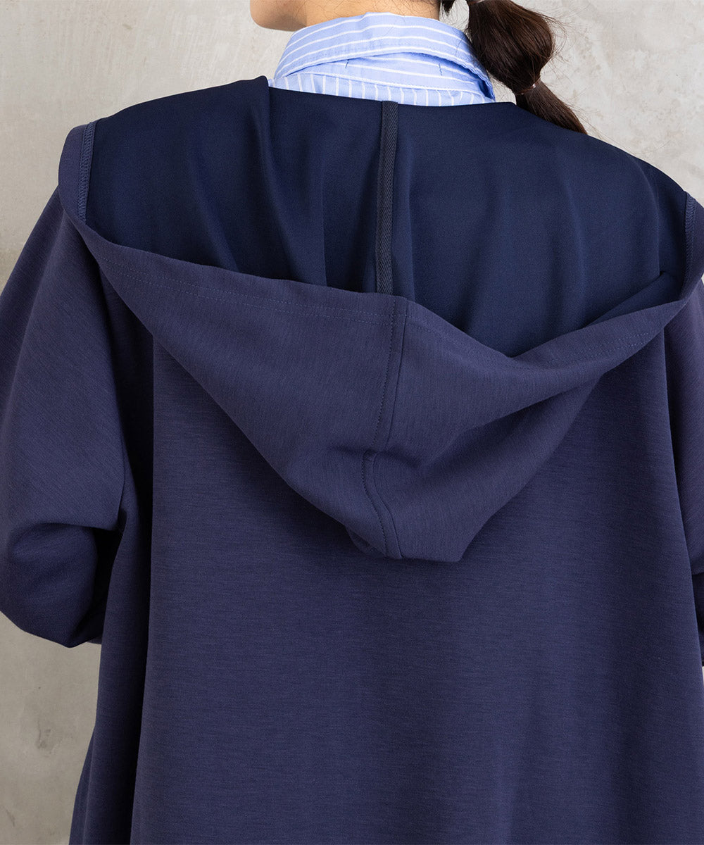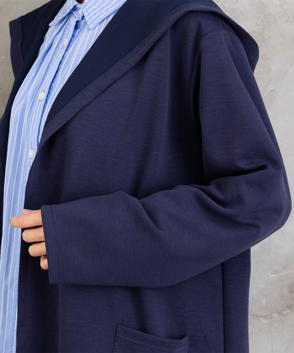 すっきりとしたノーカラーのガウンデザインにフードをプラスし、抜け感のある大人カジュアルに仕上げました。