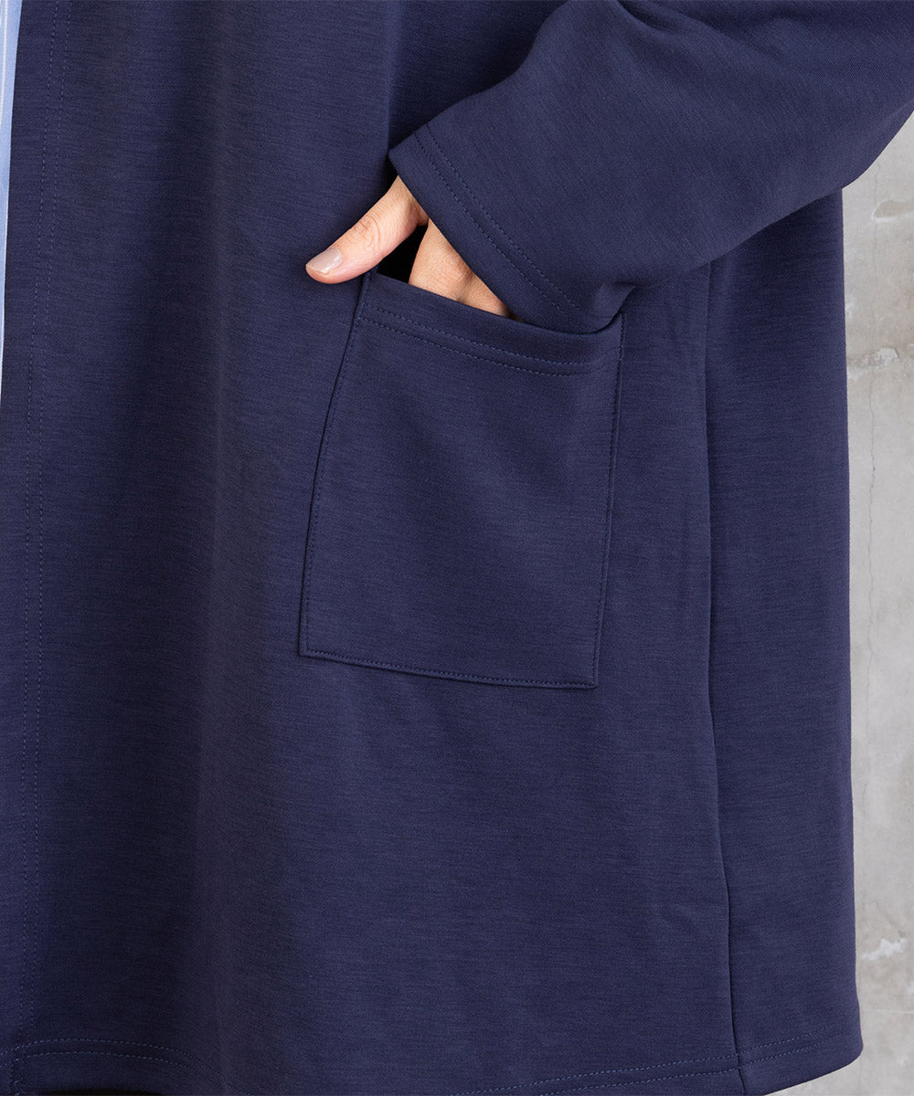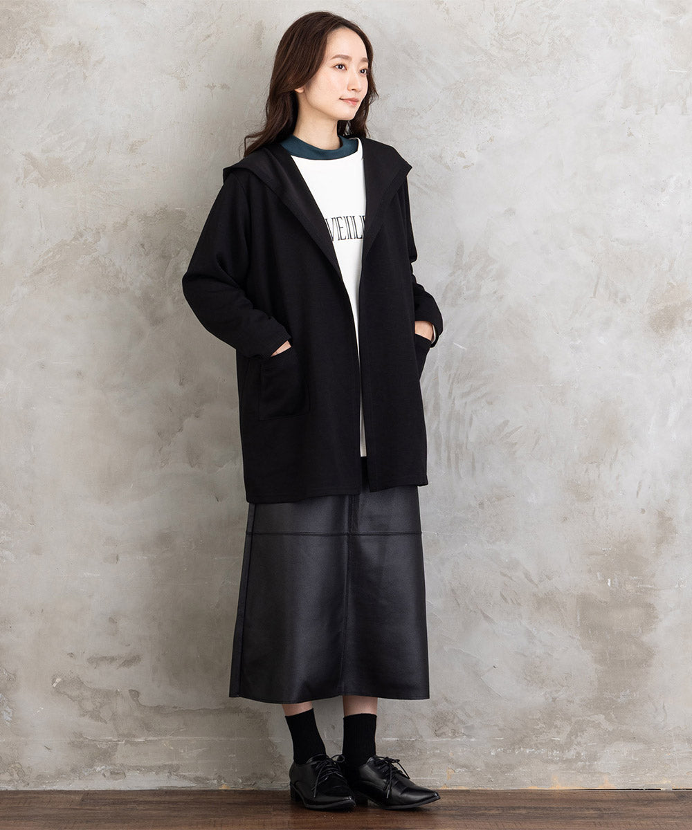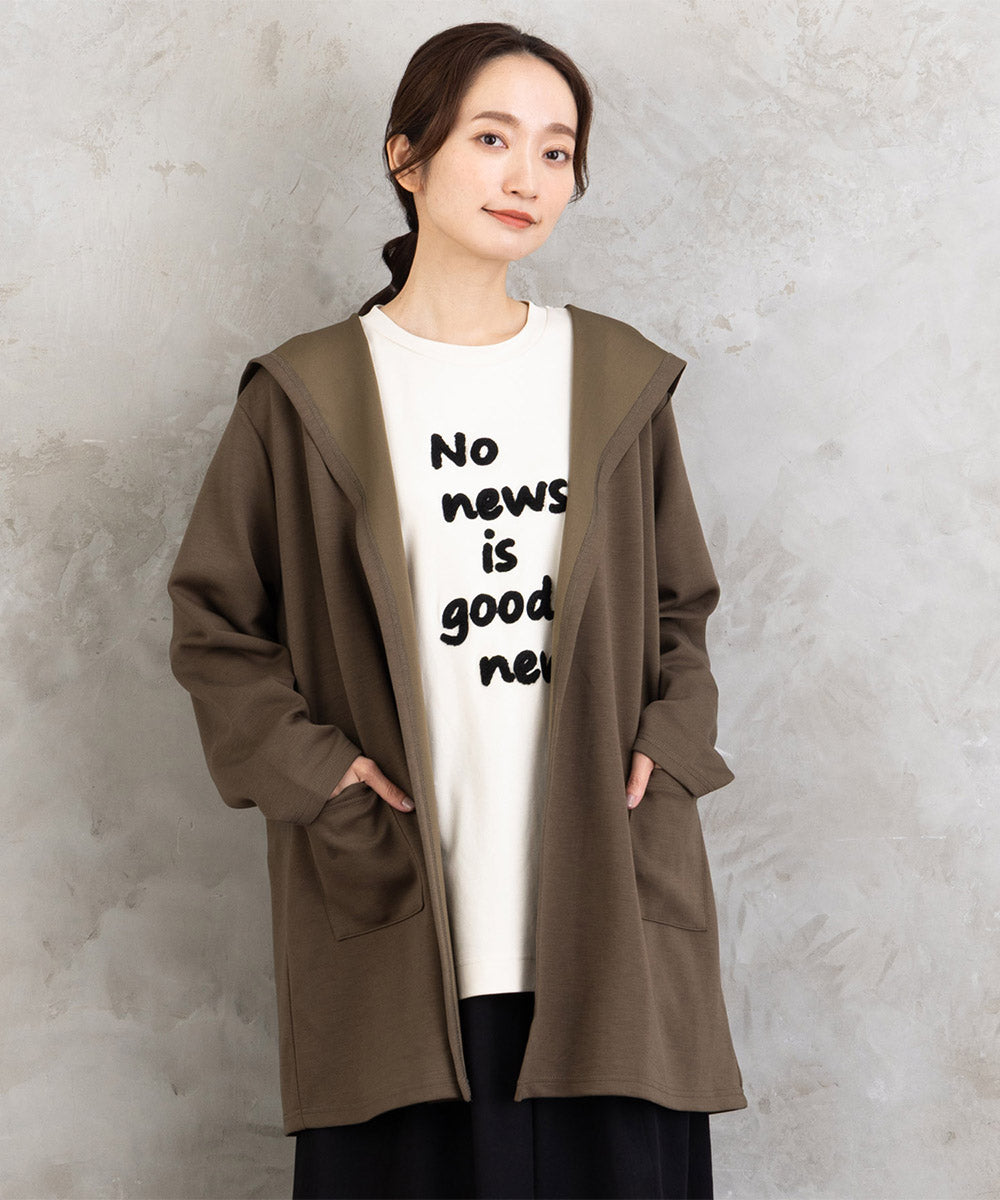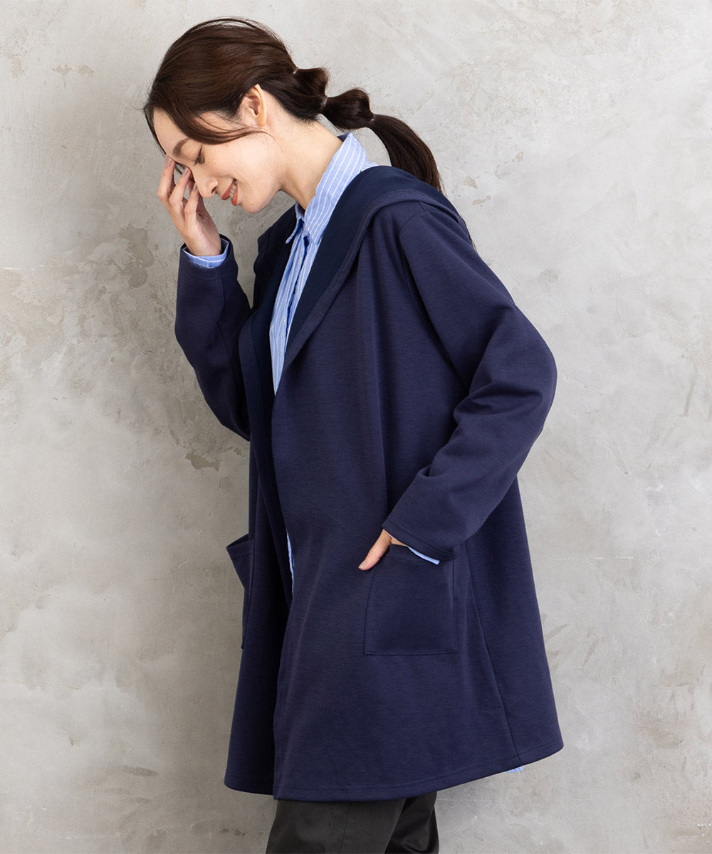 すっきりとしたノーカラーのガウンデザインにフードをプラスし、抜け感のある大人カジュアルに仕上げました。