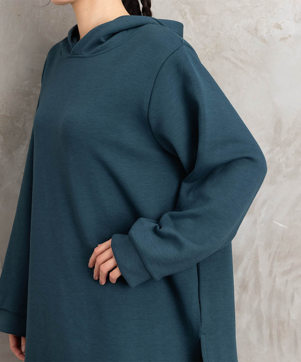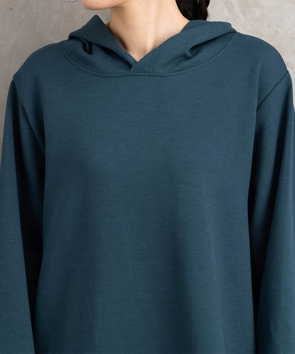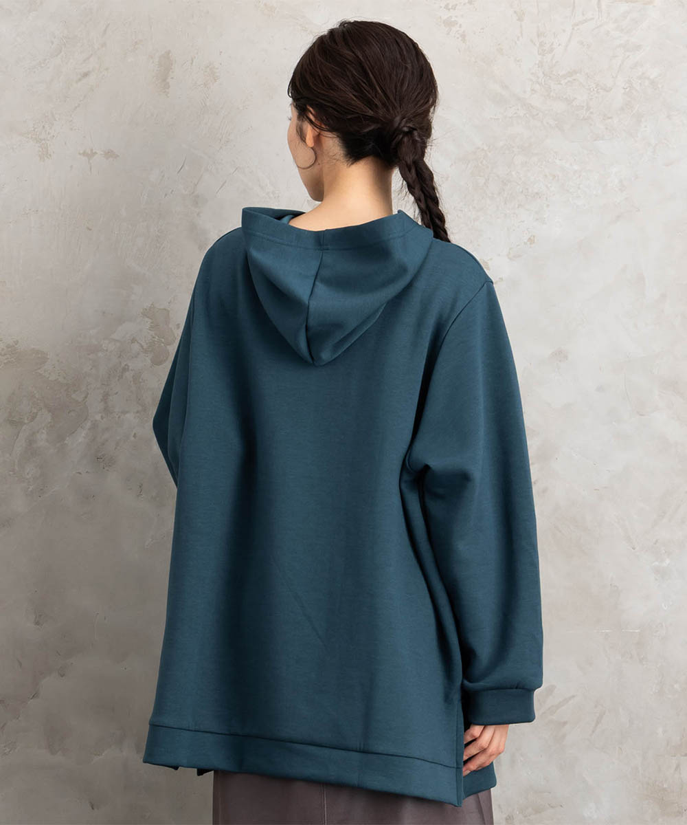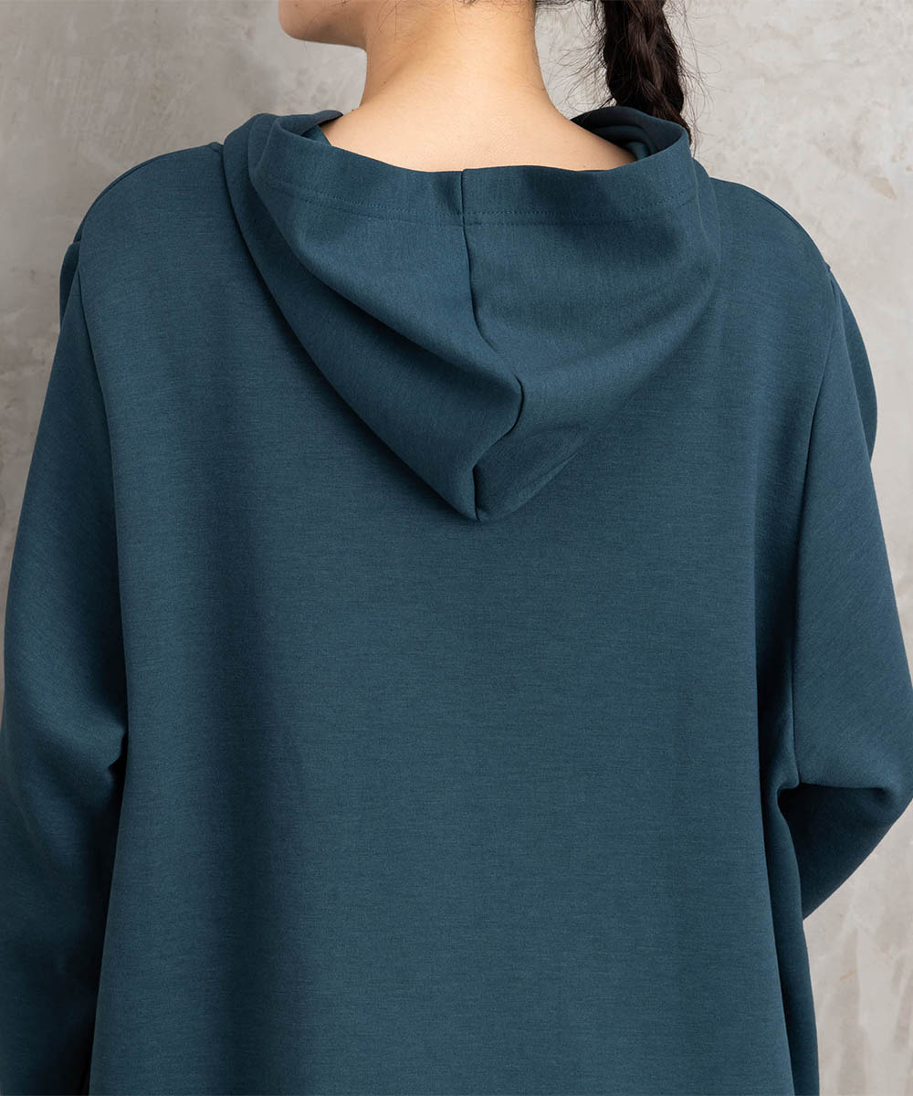 シンプルながらフードデザインがアクセントになり、ラフすぎず品よく着こなせる一枚。