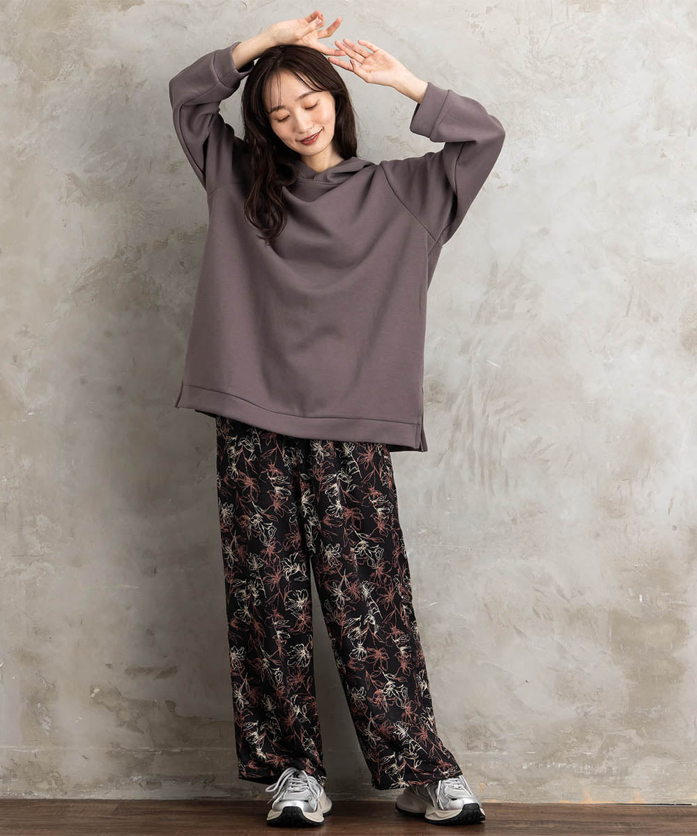 ワイドパンツと合わせてリラックス感のあるスタイルに。
