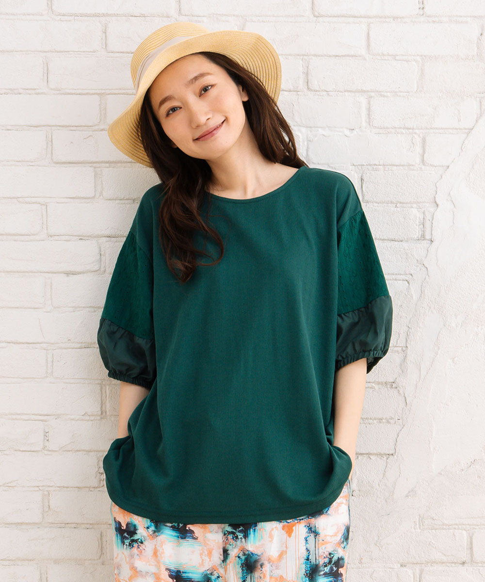身頃はシンプルな無地で着まわしやすく、袖部分にはレースと布帛を重ねたボリュームスリーブが華やかな印象に。