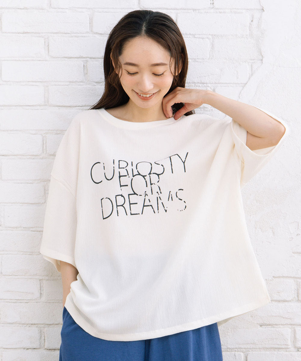 メッセージロゴが目を引く、遊び心のあるプリントTシャツ。